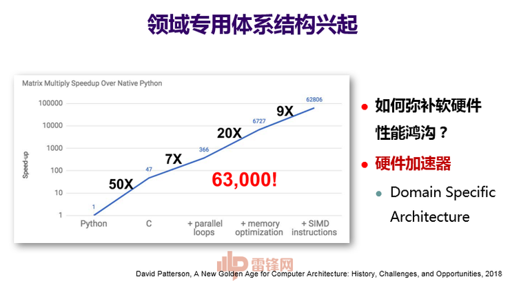 他指出,过去几年摩尔定律从每 18 个月翻一番,到现在已经变为十年甚至二十年性能才能翻一番。这似乎意味着摩尔定律就快停滞了。但从另外一个角度看,其实是领域专用体系结构正在兴起。