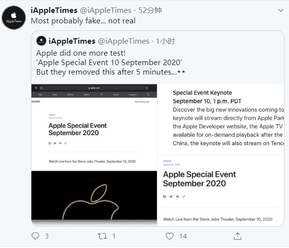 首先,今天晚上一张所谓的苹果官网截图突然开始疯传,上边的信息显示苹果将在美国9月10日举办一场特殊的发布会(Apple Special Event 10 September 2020),众人纷纷惊呼iPhone 12系列终于要来了!但很快,这张截图就被证实,是假的……