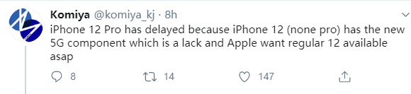 接下来是靠谱消息,不过首先是坏消息:iPhone 12 Pro、iPhone 12 Pro Max两款型号要推迟出货和上市了,原因是它们所用的5G基带供应不足,要到9月份才能全面投产,出货时间则要等到10月最后一周或者11月初。