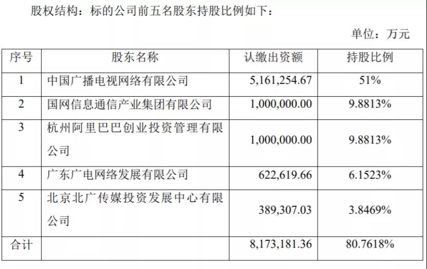 公开信息显示,参与组建“全国一网”股份公司的发起人共有47家,其中持股份额最高的前五名发起人分别是:中国广播电视网络有限公司、国网信息通信产业集团有限公司、杭州阿里巴巴创业投资管理有限公司、广东广电网络发展有限公司、北京北广传媒投资发展中心有限公司。