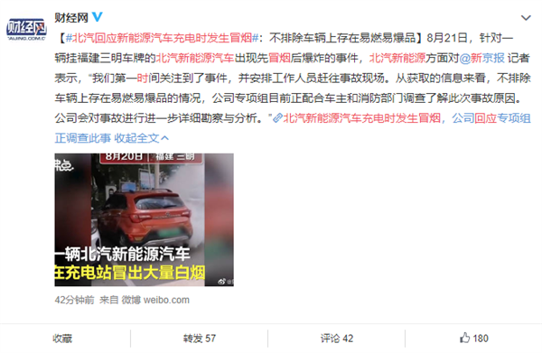 事情发生后,北汽新能源第一时间作出回应称,从获取的信息来看,事故发生及处理期间未见明火,也未见持续冒烟情况,不符合电池过热现象规律。