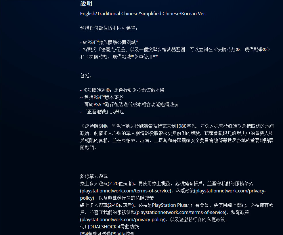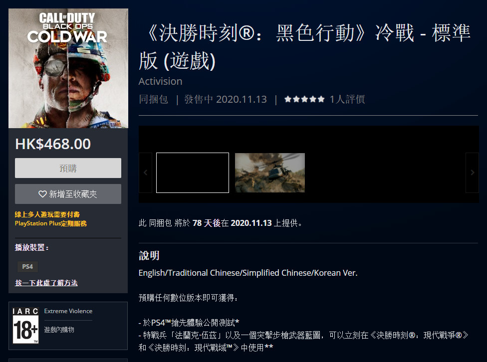 在动视今天正式公布《使命召唤17:黑色行动冷战》之后,目前各大平台已经开启了本作的预购。PSN港服,PS4标准版游戏售价468港币,约合人民币416元,支持简体中文和繁体中文。同时预购页面确认:当PS5发售时,可通过向下兼容在PS5上游玩。PS4终极版售价708港币,约合人民币628元。