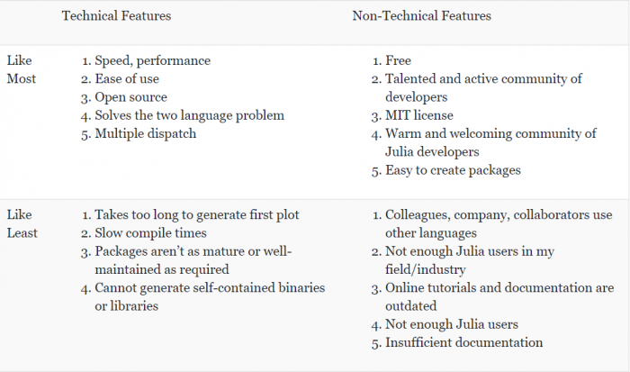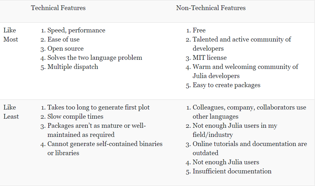对于 Julia 用户来说,速度、性能、易用性以及开源特性和语言的互操性是他们选择 Julia 的最大原因。在非技术层面,Julia 的免费、社区协作和所用的 MIT 协议是他们最喜欢的。