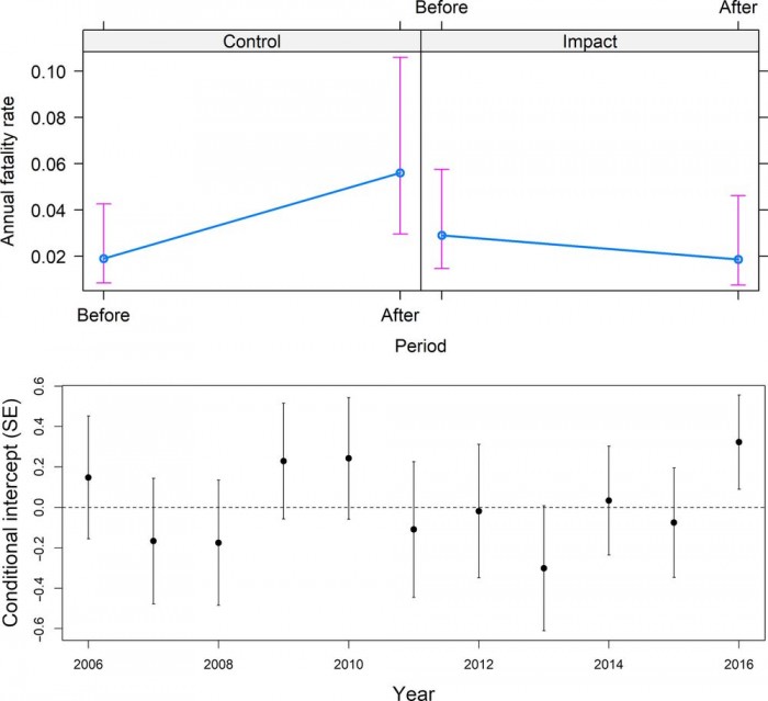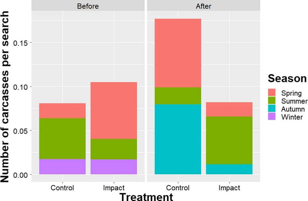 相对于相邻的对照组(即未喷漆)涡轮机,喷漆叶片的涡轮机的年死亡率显著降低了70%以上。该处理对减少猛禽死亡的影响最大;喷漆后没有记录到白尾鹰的尸体。在转子叶片上涂上对比色,显著降低了一系列鸟类的碰撞风险。
