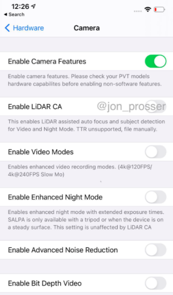 基于这款 iPhone 12 Pro Max,Jon Prosser 在 Twitter 上发布了两张系统设置截图,其中一张是关于 "相机",其中显示了 "Enable LiDAR CA" 选项,这意味着 iPhone 12 Pro Max 将搭载 LiDAR 激光雷达。