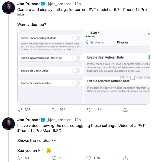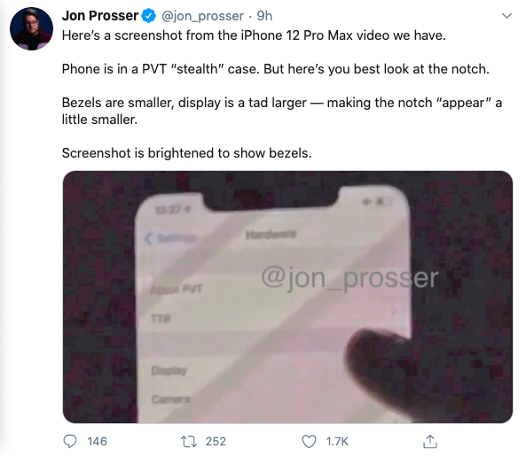 8 月 25 日,Jon Prosser 在 Twitter 平台上表示,自己手中有一个关于 iPhone 12 Pro Max 手机(6.7 英寸)的视频,不过这个手机是 PVT 版本。