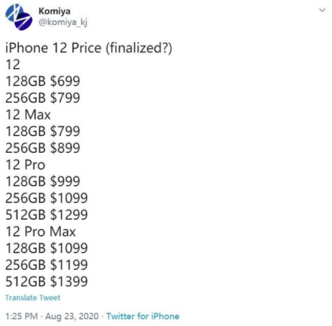 根据 Twitter 平台爆料者 @Komika 曝光的信息,iPhone 12 系列默认存储空间为 128GB 起步,最高为 512GB,起售价为 699 美元,最高售价为 1399 美元。
