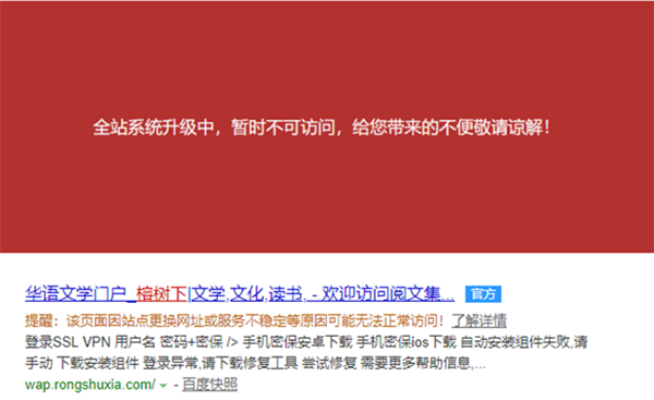 截止发稿,榕树下网站首页仍能访问,但二级内页均显示维护报错信息,在百度收录的词条中,网站下方也有“该页面因站点更换网址或服务不稳定等原因可能无法正常访问”。