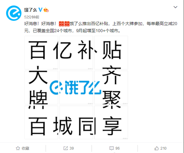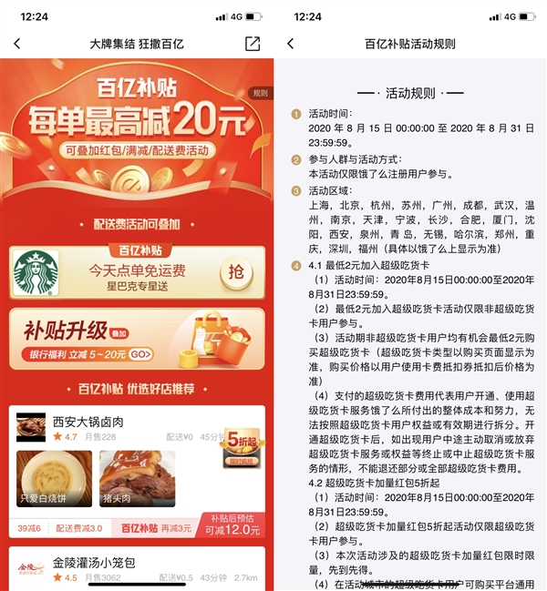 8月27日消息,饿了么宣布推出百亿补贴,上百个大牌参加,每单最高立减20元,目前已覆盖全国24个城市,9月起增至100+个城市。除了饿了么APP,大家在饿了么支付宝小程序同样可以享受百亿补贴,而且可以叠加红包/满减/配送费等活动。有饿了么内部人士透露,此次“百亿补贴”由饿了么和商家共同出资。