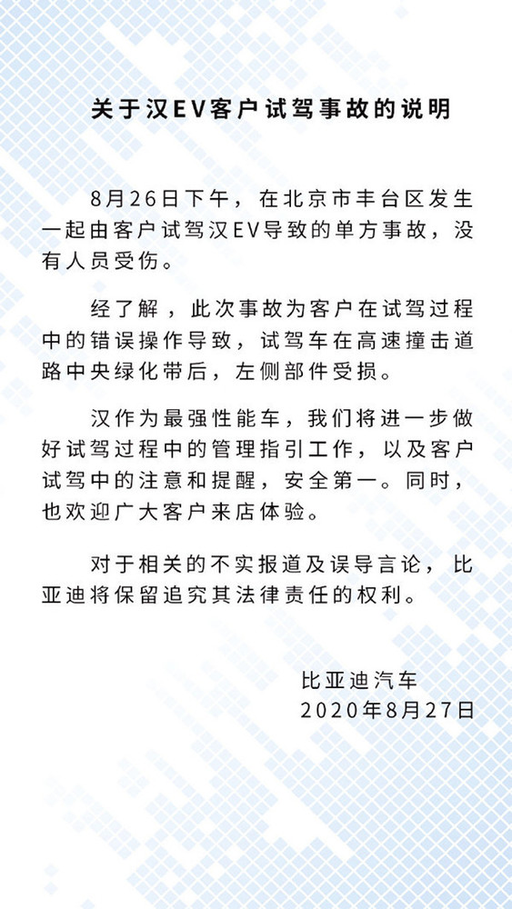 8月27日,比亚迪汽车官方对此次事件进行了回应。官方发布声明表示,经了解,此次事故为客户在试驾过程中的错误操作导致(传司机错把油门当刹车踩),试驾车在高速撞击道路中央绿化带后,左侧部件受损。同时比亚迪表示,“汉作为最强性能车,我们将进一步做好试驾过程中的管理指引工作,以及客户试驾中的注意和提醒。”