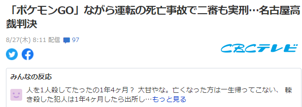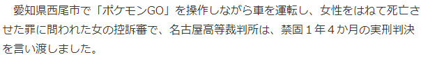 8月27日今天据日媒报道,之前倍受关注的一起因玩《宝可梦GO》开车致行人死案一审结案,名古屋高级法院判决被告有期徒刑1年4个月,网友表示判的实在太轻引发社会关注。被告榊原AKANE,女性45岁,于2018年4月在爱知县西尾市平坂町撞死一名85岁妇女,事故原因就是当时榊原AKANE正在一边玩《宝可梦GO》一边开车导致注意力下降。