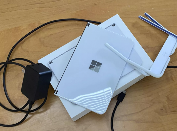 零售版Surface Duo包装盒当中有Surface Duo、USB-C充电器和橡胶保护边框。没有Surface Pen。微软声称大猩猩玻璃覆盖的Duo是坚固的,但我不知道它能不能经受住跌落。橡胶保护边框是一个信号,也许你应该小心对待它。
