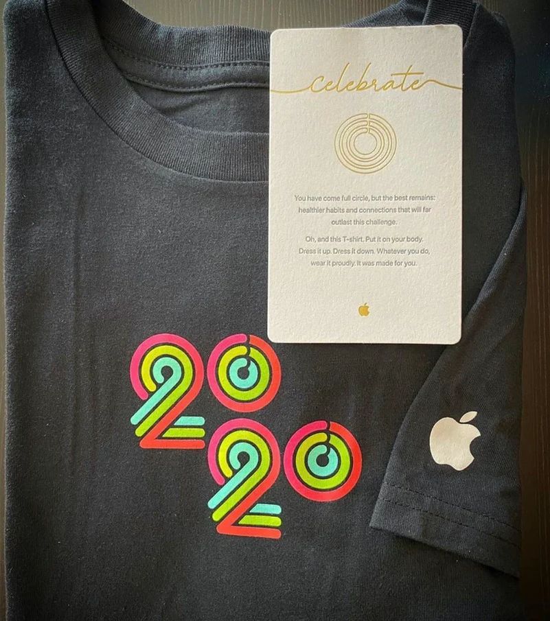现在,在过去一个月中成功完成挑战的员工都获得了奖励,这是苹果设计的T恤,上面印有“2020”的标志,并带有Apple Watch活动式的圆环。