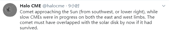 对彗星轨迹的计算估计,它将以不到140万公里的距离从太阳后面经过。“这对一颗小彗星来说是无法生存的,”NRL和NASA的“掠日彗星”项目的Karl Battams在推特上说。