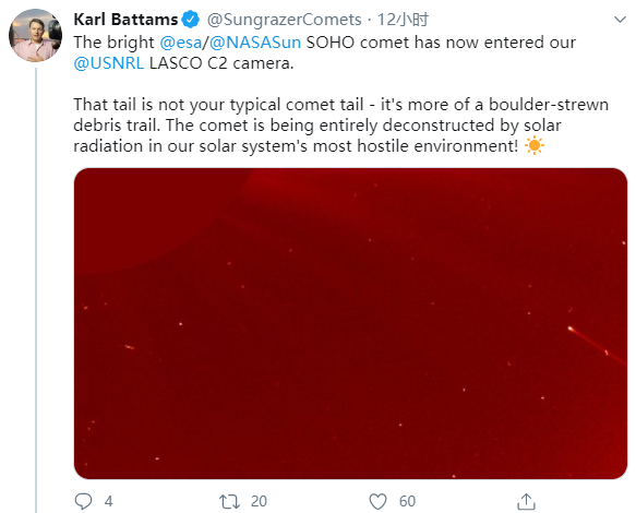 “(这颗彗星的)尾巴不是典型的彗星尾巴--它更像是一条布满巨石的碎片痕迹,”Battams写道。“这颗彗星在我们太阳系最恶劣的环境中,完全被太阳辐射分解了!”