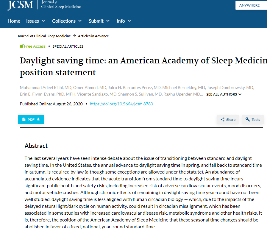 “永久的,全年的标准时间是最接近我们昼夜睡眠-醒觉周期的最佳选择,”论文主要作者M.Adeel Rishi说,他是梅奥诊所的睡眠专家,也是美国睡眠医学学会公共安全委员会的副主席。“夏令时的结果是早上更黑,晚上更亮,打乱了身体的自然节奏。”