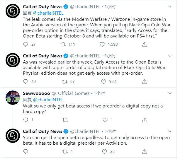 据悉,该信息来源于《使命召唤:现代战争》(COD16)阿拉伯语版游戏商店,当玩玩家点击预购《使命召唤:黑色行动5》的时候,就会弹出与该作有关的一些消息,其中一栏显示着:《使命召唤17:黑色行动5》将于2020年10月8日在PS4平台上首先开启多人模式公测。