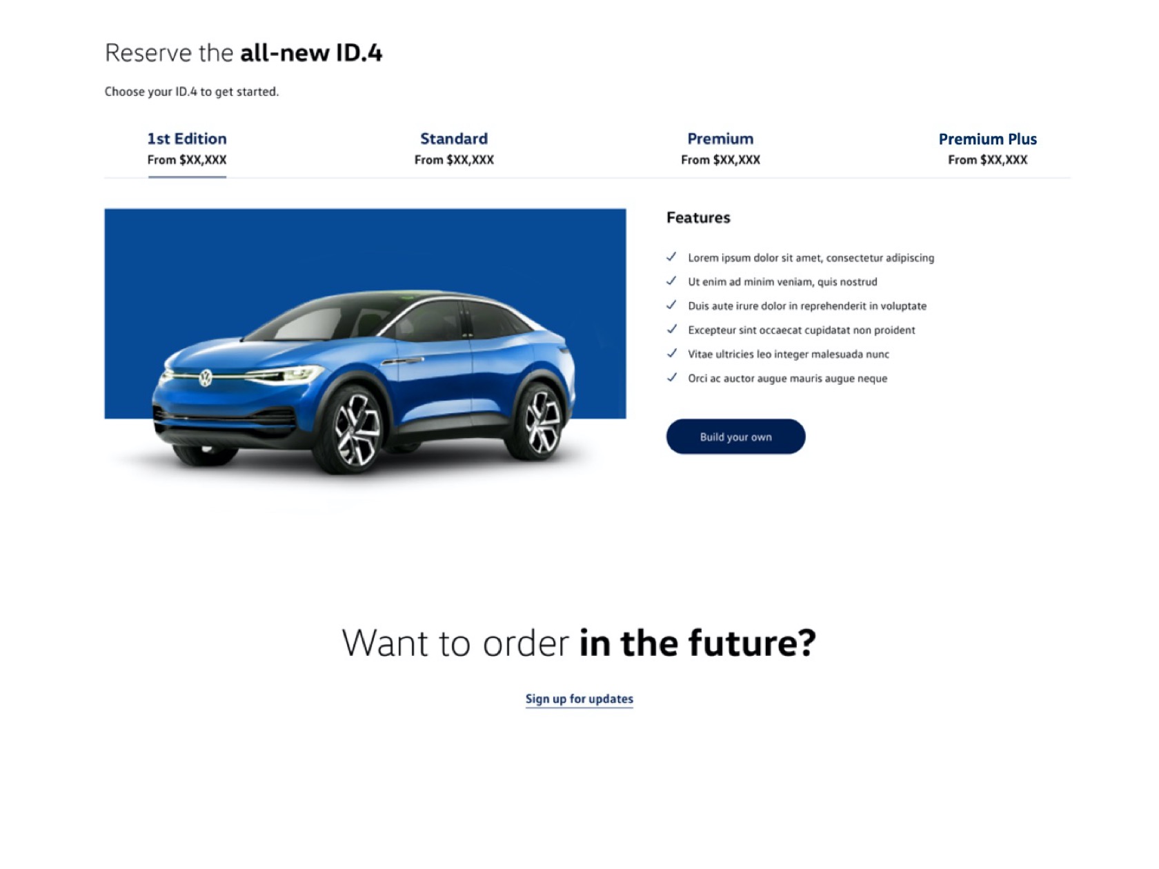 可以看到,大众ID.4将会采取类似于奥迪2019款e-tron SUV那样的销售策略。当其在下月正式发布之后,ID.4网站将充当一个研究工具,消费者可以在上面看到这款车的价格、续航里程、套件选择等信息,另外大众还会在上面解释消费者选择电动汽车的原因以及拥有电动汽车之后给其生活带来的改变。