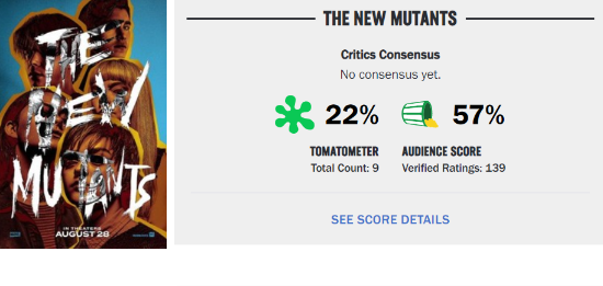 经过5次改档的乔什·波恩《X战警:新变种人》于当地时间8月28日在北美正式上映,观众们能看这部电影可真是不容易,看起来影评人也等来了一部可以吐槽的大片。今日本片口碑正式解禁,截至发稿前它在烂番茄上的新鲜度(媒体打分)为22%,爆米花值(观众打分)为57%,评价不容乐观。