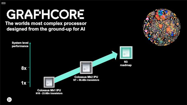 最近该公司才推出了第二款产品——Colossus MK2 IPU芯片,相比之前的16nm工艺Colossus MK1 IPU芯片,Colossus MK2升级到了7nm工艺,晶体管数量从236亿增加到了594亿个,有效核心数高达1472个。