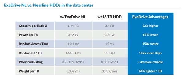 在容量上,ExaDrive NL系列硬盘每个机架内可以做到1.44PB,18TB机械盘也只有0.4PB,容量就相差3.6倍。