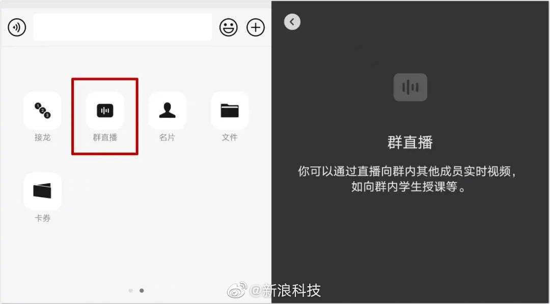 不过,微信群聊的“群直播”和此前企业微信的群直播不相同。微信群直播支持用户人人参与。而企业微信“群直播”功能2020年2月1日上线,曾在微信聊天对话框中短暂出现过“上课直播”和“健康收集”两个限时推广入口。