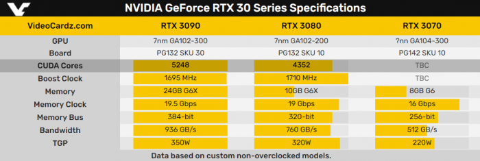 新品发布前总会有曝料,但是像VideoCardz这样直接把RTX 3080、RTX 3090的几乎所有核心规格都捅出来,RTX 3070也曝出一大部分的,实在不多见。按照最新说法,NVIDIA将在9月份发布三款新卡,分别是RTX 3090 24GB、RTX 3080 10GB、RTX 3070 8GB,AIC厂商还在准备RTX 3080 20GB,但仍未最终敲定。