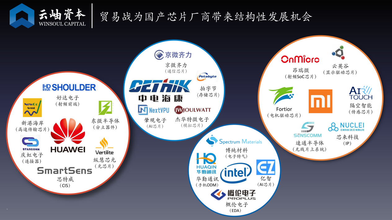 贸易摩擦下,中国对被“卡脖子”的半导体产业链上游国产化有强烈需求,因此“卡脖子”领域的每个细分方向都存在机会。同时,CPU、DSP、FPGA、EDA等关键器件和软件的未来成长机会也值得关注。