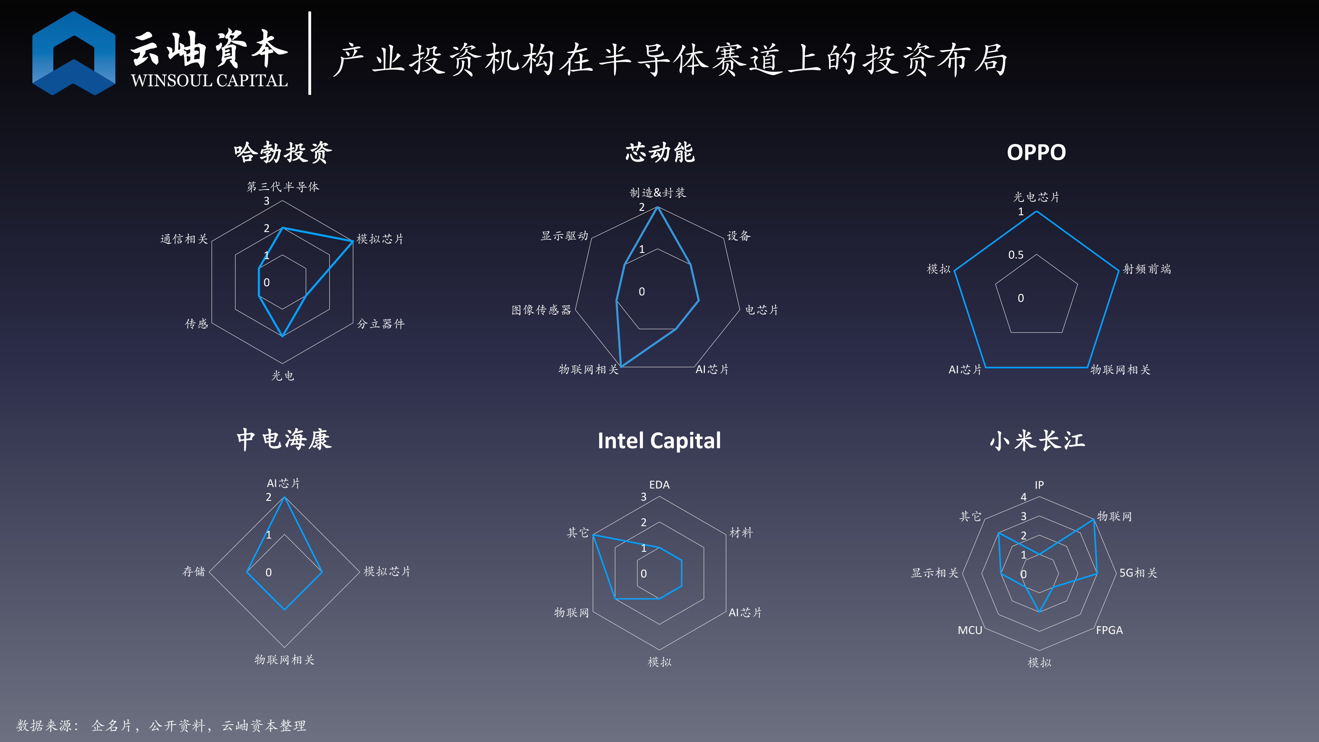 产业资本中,华为的投资重点在于模拟芯片和器件,对数字芯片关注较少;芯动能由于京东方的背景,关注制造封装、显示驱动和物联网;OPPO关注光芯片、物联网、5G射频;中电海康关注AI芯片、物联网和模拟芯片等符合海康战略及供应链体系的方向;小米关注上下游生态机会,重点领域在于消费电子和物联网;Intel看中设备材料和PC、服务器产业链。