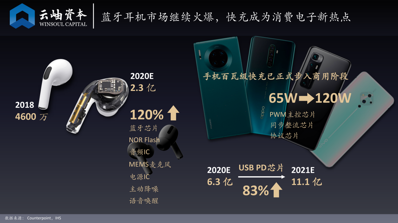 下游市场中的蓝牙耳机市场继续火爆,带动了上游芯片和原材料的业绩爆发。快充成为今年消费电子的新热点后,也加速了硅基氮化镓芯片的快速商业化。2021年,快充芯片的需求有望超过11亿颗。
