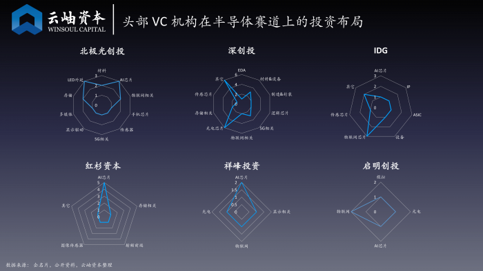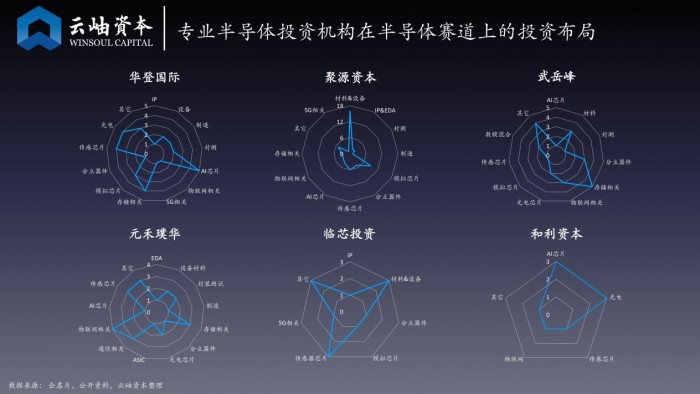 专业投半导体的机构中,华登国际、武岳峰、元禾璞华、临芯投资、和利资本对于AI、存储、物联网、模拟芯片等领域关注较多。聚源资本由于中芯国际的背景,重点布局材料和设备领域。