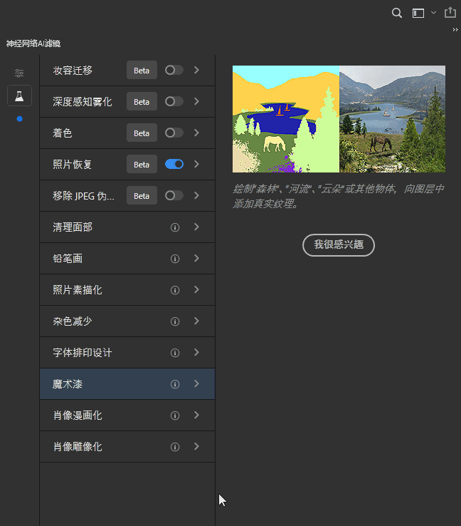 黑白照片上色也是时下很火的一个话题,之前我们也曾介绍过类似的在线网站。PS 2021里将这项功能融入到神经网络AI滤镜中,通过侧边按钮加以切换。