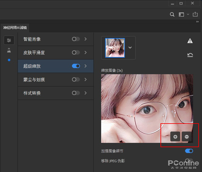 图片缩放在日常工作中用到很多,之前的Photoshop也升级过多次算法,但效果依旧不理想。“超级缩放“同样也是神经网络AI滤镜里的一个子模块,类似于AI智能放大网站。整个使用依旧比较傻瓜,打开”神经网络AI滤镜“后,勾选其中的”超级缩放“即可看到操作面板,需要放大或缩小,在预览窗中点击对应的放大/缩小按钮即可。
