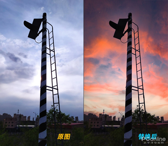 整个功能使用还是比较容易的,首先调入一张照片(带有天空场景),点击“编辑→天空替换”,稍后PS会打开一个小面板。这里最顶端是几组预置天空,分成蓝天、日落、状观三大类。想要替换某组“天空”,直接在预设栏里点击即可。除了替换天空外,前景的明暗度、色温值也会自动改变,从而看上去更加自然。