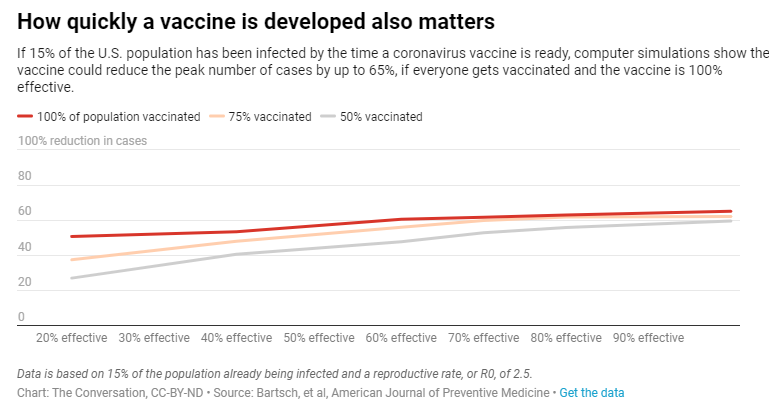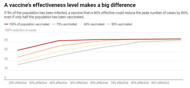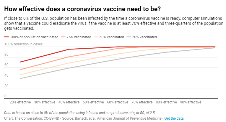 根据CNBC的报道,研究这个问题的研究人员准备的一个计算模型发现,如果75%的人口接种了新冠疫苗,那么在没有任何其他需要配合疫苗的措施(比如继续保持社交距离)的情况下,至少需要80%的有效性才能结束这场大流行。不过,这个有效程度可能不会达到这么高,尤其是考虑到根据CDC的数据,每年的流感疫苗一般只能降低40%到60%的流感感染风险。同样,白宫健康顾问安东尼-福奇博士也表示,虽然希望疫苗的有效性至少达到75%,但美国食品和药物管理局(FDA)已经计划授权一种疫苗,即使一种疫苗的有效性只有50%或更高。