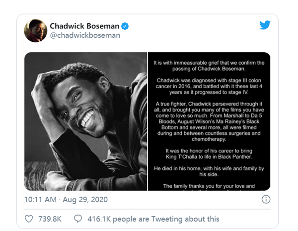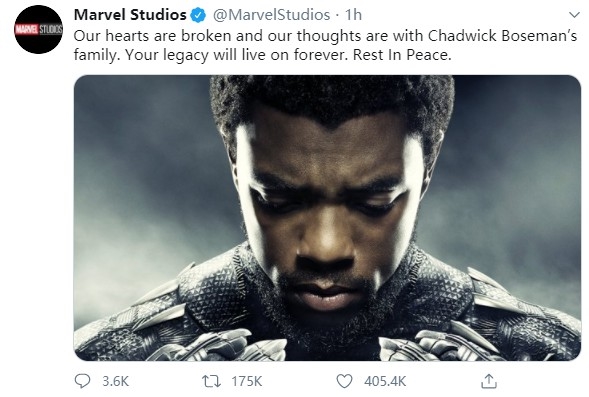 漫威影业官微写道:“永远的“黑豹”查德维克·博斯曼一路走好,我们将铭记你的传奇。Wakanda Forever 。”