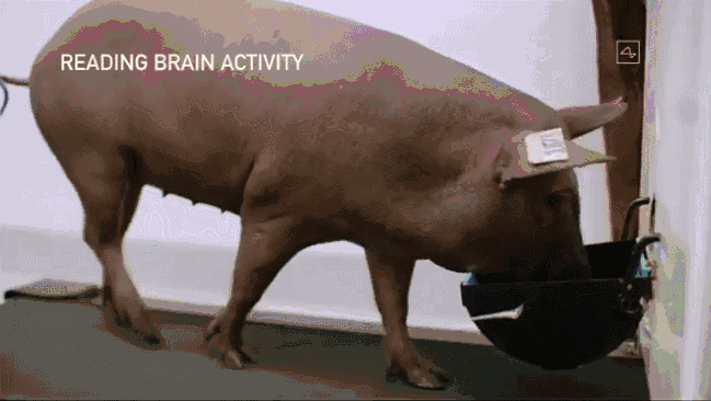 之后,Elon Musk 主要展示的是一只正在佩戴植入物的小猪,其大脑信号可被实时收集到。