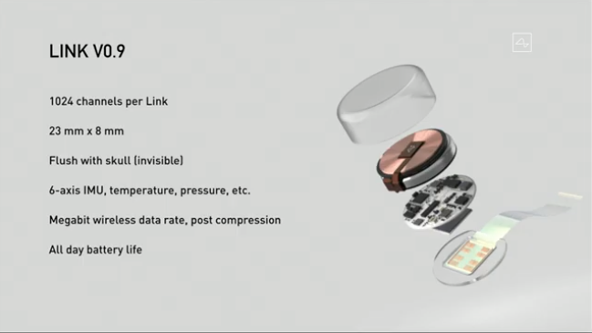 简单的背景介绍后,Elon Musk 展示了最新的可穿戴设备 LINK V0.9。一个设备配备 1024 个频道,能够感应温度和气压,读取脑电波、脉搏等信号,支持远程数据无线传输。几乎可以在白天使用一整天后,晚上进行充电。
