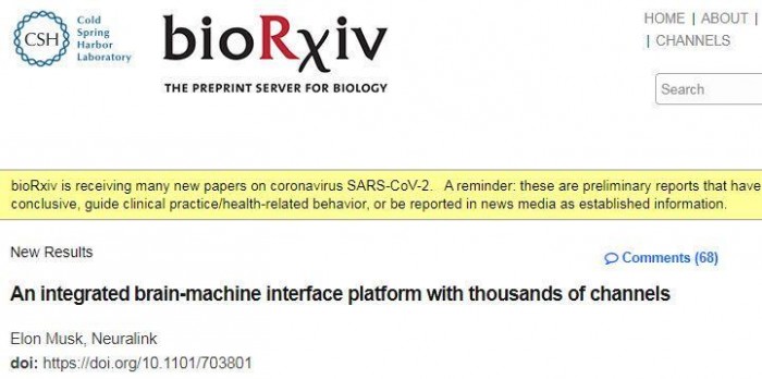 2019 年 8 月 2 日,论文发表在预印本平台 bioRxiv 上,题为 An integrated brain-machine interface platform with thousands of channels(具有数千个通道的集成脑-机接口平台),署名作者正是 Elon Musk & Neuralink。