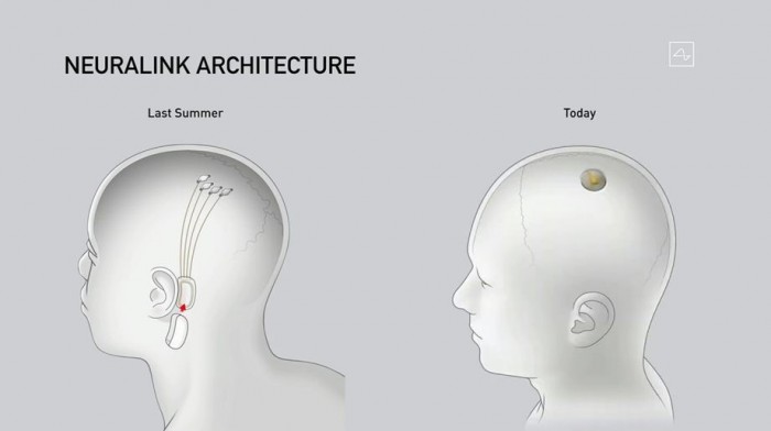 左边为 Neuralink 上一代脑机接口解决方案,需要在耳后佩戴一个装置;右边是最新的方案,只需要一颗芯片