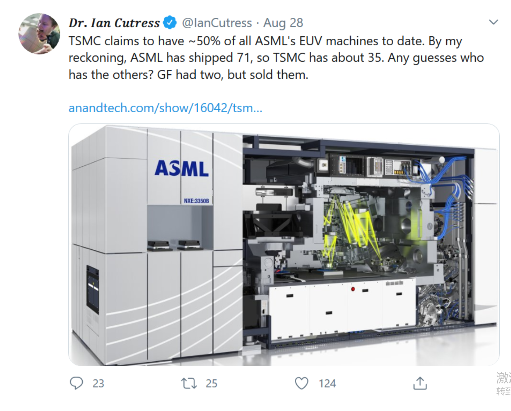 ASML是唯一一家生产和销售EUV光刻设备的公司,据Cutress估计,台积电已经从这家公司手中购买了30-35台设备。据估计,ASML今年已售出约70台机器,等到底可能会达到90台。