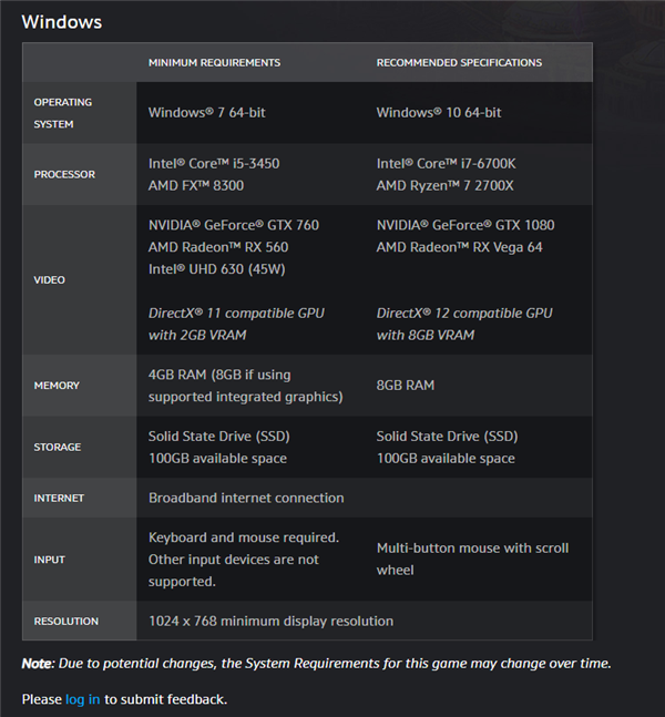 从官方配置要求来看,最低配置需要酷睿i5-3450/FX-8300处理器、GTX 760/RX 560显卡,集显最低也要UHD 630了。
