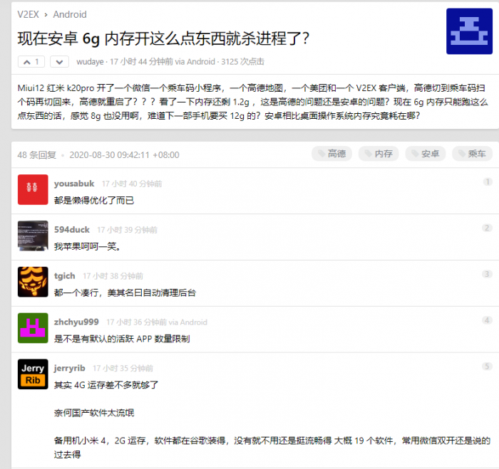 V2EX上网友就在吐槽,他的手机内存明明还剩下1.2GB之多,开高德地图扫个码再切回来,高德应用就重启了。