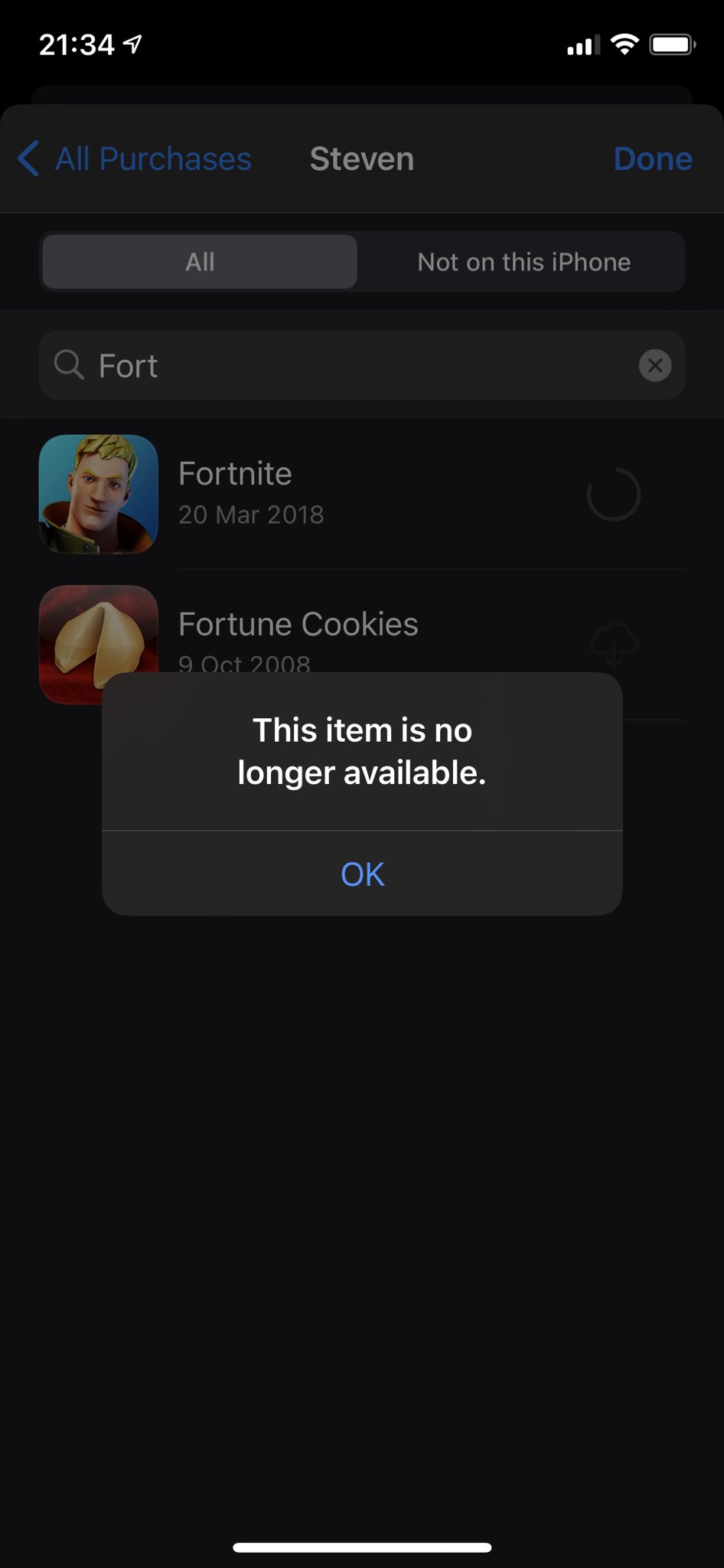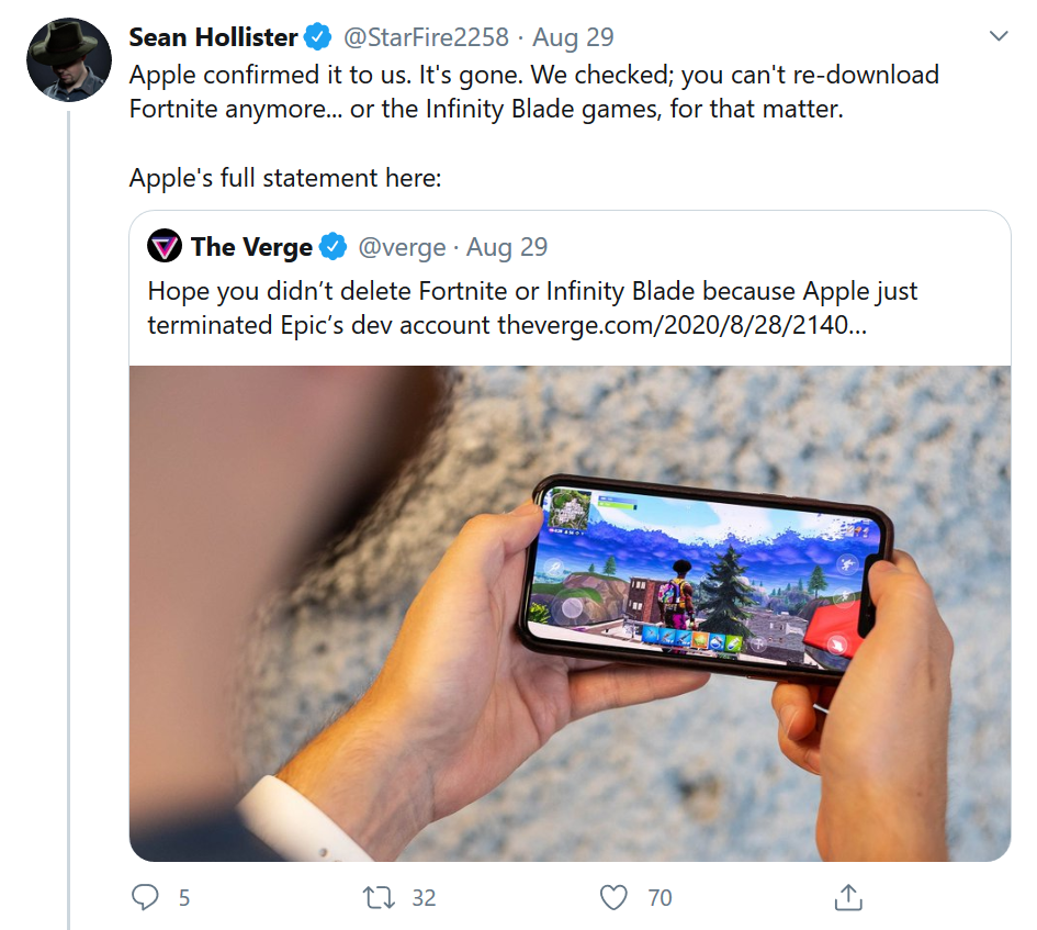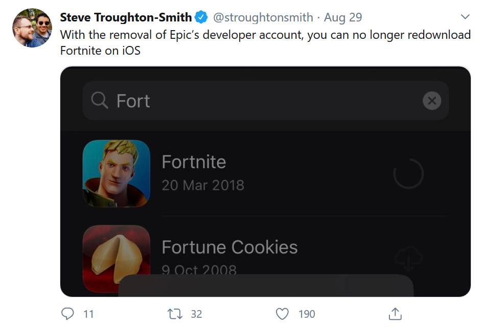 在苹果在周五禁掉Epic账号之前,用户仍可以在iPhone和iPad上下载到《堡垒之夜》并安装。然而现在,既然Epic开发者账号已经被注销那么应用自然无法重新安装。