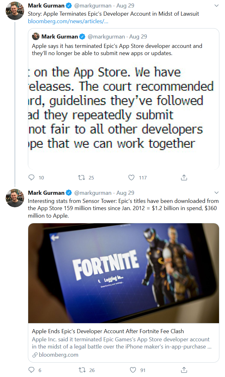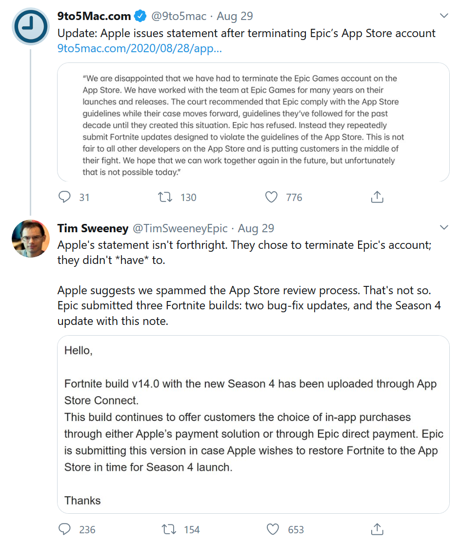 Epic的Tim Sweeney则在Twitter上迅速做出回应,称苹果的声明并不坦诚,苹果并没有终止Epic开发者账号的必要。