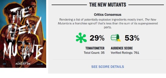 《X战警:新变种人》近日在北美上映,凭借310万美元的首日票房成绩登顶当日票房榜榜首,同时创造了最近几个月来的最高单日票房。不过相比票房成绩,影片的口碑却较令人担忧,目前它在烂番茄的新鲜度29%稍有回升,但爆米花值已经降至53%,大多数影评人和观众对它的印象看来并不好。