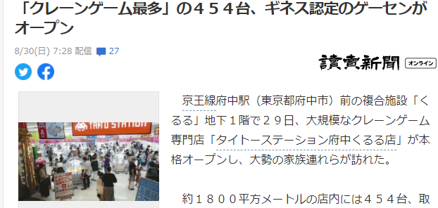 拥有最多抓娃娃机的一家游戏厅于8月29日在东京府中市开张,多达454台各类抓娃娃机的惊人数量也使得该店铺成为了新的吉尼斯纪录保持者。这家日本最大抓娃娃机游戏厅位于东京府中市的京王线府中站前地下广场,面积达到1800平米的店内分布着454台各种类型的抓娃娃机,还因此获得了“单一会场设置最多抓娃娃机”的吉尼斯纪录。