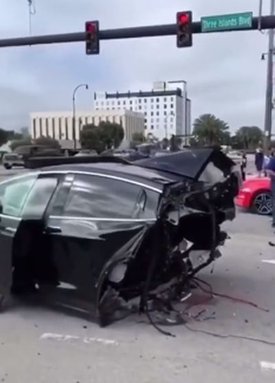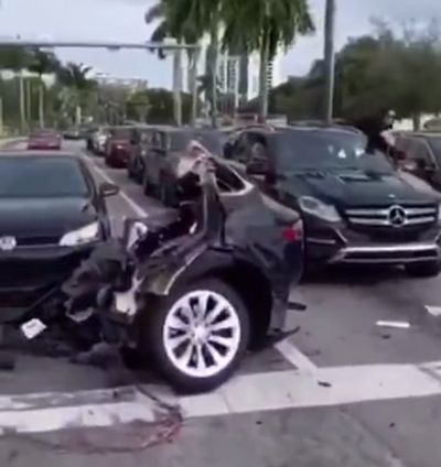 但是碰撞结果却是特斯拉Model X完败,因为其后车门的后部,被完全撞断了,连带着后驱动轴的整个车身后部,完全从车体上脱落后,并撞向了路口的大众汽车。