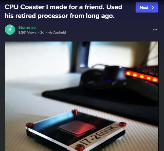 你的电脑升级后的过气配件怎么处理?便宜卖给二手商么,近日一位国外玩家将换下的CPU改造杯垫晒到网上,酷炫实用引发网友热赞。QuestionMore94最近刚刚DIY升级了自己的电脑,于是将换下来的旧CPU、2011年发售的Core i7 2600K直接给废物利用,改造成了一个杯垫,晒到网上后引发网友热议。
