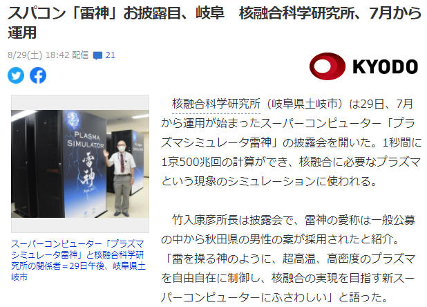 8月29日,日本核融合科学研究所正式公开了最新超级计算《等离子模拟器 雷神》,据悉该超算“雷神”可实现每秒钟1京500兆(1亿亿500万亿)次运算,专门用于模拟计算核融合必须的等离子现象。